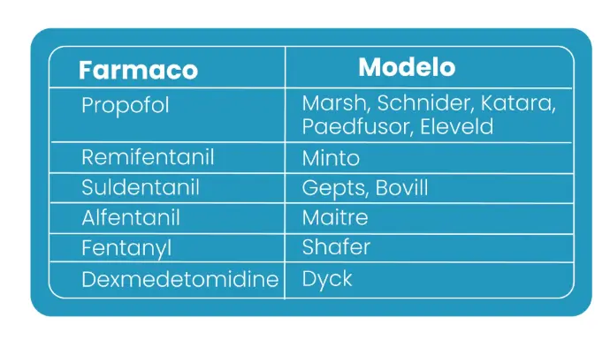Los modelos de fármacos y el rango de configuración de parámetros compatibles con el dispositivo para la infusión TCI